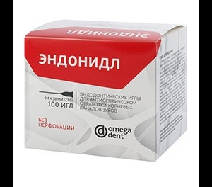 «Эндонидл» представляет собой специальную эндодонтическую иглу с оптимальным диаметром 0,4 мм (27 G), 0,3 мм (30 G) длиной 35-38 мм. Имеет тупой срез кончика иглы. Это делает невозможным механическое повреждение апекса. На расстоянии 3мм от тупого конца иглы выполнена латеральная перфорация (одно или два боковых отверстий).Это делает невозможным заапикальное введение ирригационного раствора и создание чрезмерного давления в периапикальной области, что может пагубно воздействовать на периодонт.