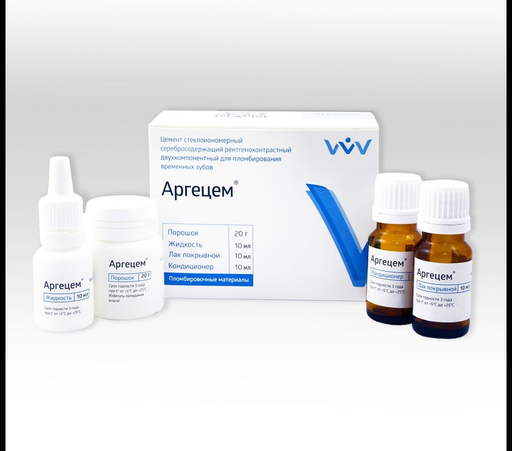 Аргецем - стеклоионом. рентгеноконтр. серебросод. цемент хим. отв. 20г пор, по 10мл жидк., конд, лак
