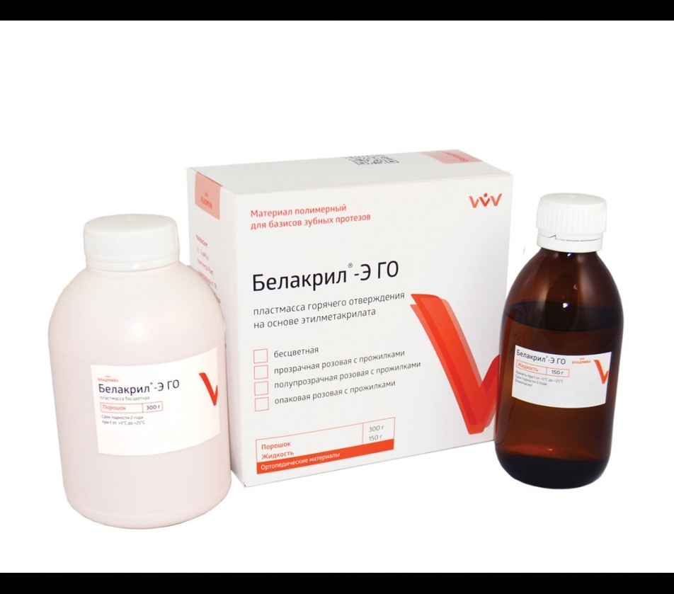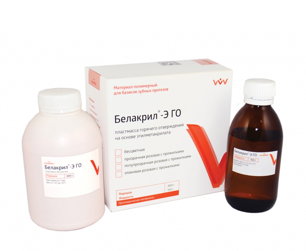 Белакрил Э ГО, базисн. пластмасса горячего отв., бесцветная, уп- порошок 300г, жидкость 150г